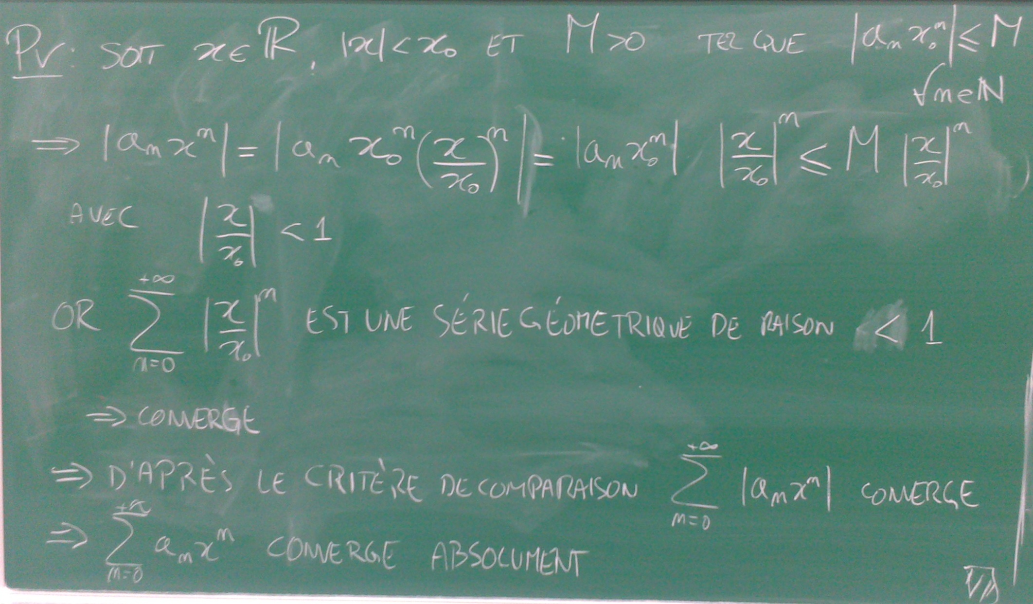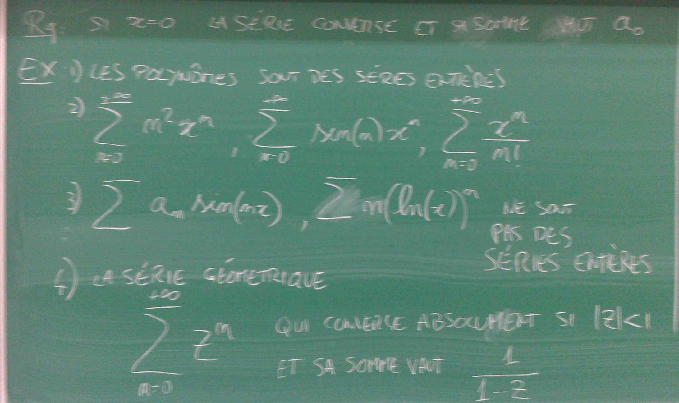 - Séance du 13/11/2013 : Convergence normale, séries entières : définition, exemple d’utilisation. Les clichés du tableaux sont disponibles sur moodle. Pour s’y connecter, se rendre sur http://mathserv.cnam.fr/moodle-232/login/index.php?authCAS=NOCAS se connecter de manière anonyme, puis chercher le cours Analyse et Calcul Matriciel.